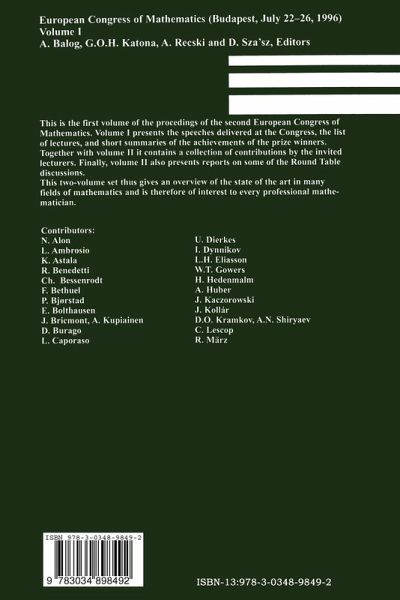 This is the first volume of the procedings of the second European Congress of Mathematics. Volume I presents the speeches delivered at the Congress, the list of lectures, and short summaries of the achievements of the prize winners. Together with volume II it contains a collection of contributions by the invited lecturers. Finally, volume II also presents reports on some of the Round Table discussions. This two-volume set thus gives an overview of the state of the art in many fields of mathematics and is therefore of interest to every professional mathematician. Contributors: Vol. I: N. Alon, L. Ambrosio, K. Astala, R. Benedetti, Ch. Bessenrodt, F. Bethuel, P. Bjørstad, E. Bolthausen, J. Bricmont, A. Kupiainen, D. Burago, L. Caporaso, U. Dierkes, I. Dynnikov, L.H. Eliasson, W.T. Gowers, H. Hedenmalm, A. Huber, J. Kaczorowski, J. Kollár, D.O. Kramkov, A.N. Shiryaev, C. Lescop, R. März. Vol. II: J. Matousek, D. McDuff, A.S. Merkurjev, V. Milman, St. Müller, T. Nowicki, E. Olivieri, E. Scoppola, V.P. Platonov, J. Pöschel, L. Polterovich , L. Pyber, N. Simányi, J.P. Solovej, A. Stipsicz, G. Tardos, J.-P. Tignol, A.P. Veselov, E. Zuazua