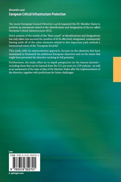The recent European Council Directive 114/08 requested the EU Member States to perform an assessment aimed at the identification and designation of the so-called European Critical Infrastructures (ECI). Every analysis of the results of the "first round" of identifications and designations has only taken into account the numbers of ECIs effectively designated, consequently leaving aside all of the other elements related to this important path towards a harmonized vision of the "European Security". This work, with its unprecedented approach, focuses on the elements that have maximized or frustrated the ambitious European objectives and on the issues that might have prevented the directive reaching its full potential. Furthermore, the study offers an in-depth perspective on the lessons learned - including those that can be learned from the US pre-post 9/11 CIP policies - as well as an assessment of the state of play of the Member States after the implementation of the directive, together with predictions for future challenges.