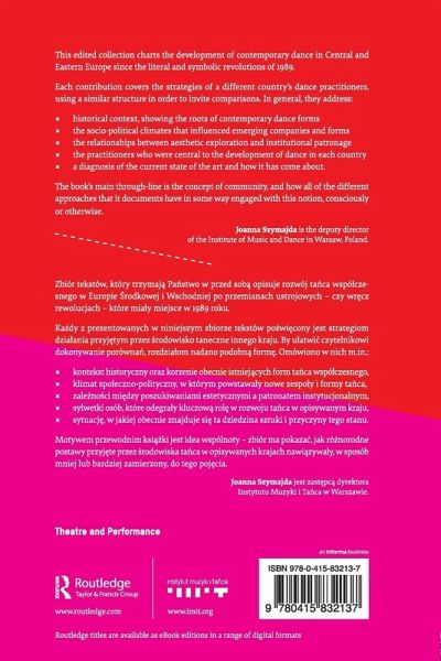 This edited collection charts the development of contemporary dance in Central and Eastern Europe since the literal and symbolic revolutions of 1989. Central Europe and the former Soviet Bloc countries were a major presence in dance - particularly theatrical dance - throughout the twentieth century. With the fragmentation of traditional structures in the final decade of the century came a range of aesthetic and ideological responses from dance practitioners. These ranged from attempts to reform classical ballet to struggles for autonomy from the state, and the nature of each was influenced by a set of contexts and circumstances particular to each country. Each contribution covers the strategies of a different country's dance practitioners, using a similar structure in order to invite comparisons. In general, they address: Historical context, showing the roots of contemporary dance forms The socio-political climates that influenced emerging companies and forms The relationships between aesthetic exploration and institutional patronage The practitioners who were central to the development of dance in each country A diagnosis of the current state of the art and how it has come about The book's main through-line is the concept of community, and how all of the different approaches that it documents have in some way engaged with this notion, consciously or otherwise. This can take the form of oppositional relationships, institutional formations, or literally, in identifiable communities of dancers and choreographers.