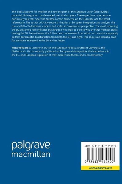 This book accounts for whether and how the path of the European Union (EU) has developed towards potential disintegration. These questions have become particularly relevant since the outbreak of the debt crises in the Eurozone and the Brexit referendum. The author critically subverts theories of European integration and analyses the rise and fall of federations, empires and states in a comparative perspective. The most promising theory presented here indicates that Brexit is not likely to be followed by other member states leaving the EU. Nevertheless, the EU has been undermined from within as it cannot adequately address Eurosceptic dissatisfaction from both the left and right. This book is an essential read for everyone interested in the EU and its future.