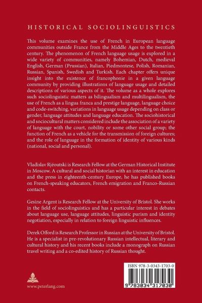 This volume examines the use of French in European language communities outside France from the Middle Ages to the twentieth century. The phenomenon of French language usage is explored in a wide variety of communities, namely Bohemian, Dutch, medieval English, German (Prussian), Italian, Piedmontese, Polish, Romanian, Russian, Spanish, Swedish and Turkish. Each chapter offers unique insight into the existence of francophonie in a given language community by providing illustrations of language usage and detailed descriptions of various aspects of it. The volume as a whole explores such sociolinguistic matters as bilingualism and multilingualism, the use of French as a lingua franca and prestige language, language choice and code-switching, variations in language usage depending on class or gender, language attitudes and language education. The sociohistorical and sociocultural matters considered include the association of a variety of language with the court, nobility or some other social group; the function of French as a vehicle for the transmission of foreign cultures; and the role of language in the formation of identity of various kinds (national, social and personal).