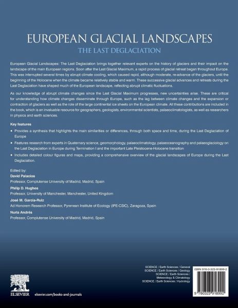 European Glacial Landscapes: Last Deglaciation brings together relevant experts on the history of glaciers and their impact on the landscape of the main European regions. Soon after the Last Glacial Maximum, a rapid process of the glacial retreat began throughout Europe. This was interrupted several times by abrupt climate cooling, which caused rapid, although moderate, re-advance of the glaciers, until the beginning of the Holocene when the climate became relatively stable and warm. These successive glacial advances and retreats during the Last Deglaciation have shaped much of the European landscape, reflecting abrupt climatic fluctuations. As our knowledge of abrupt climate changes since the Last Glacial Maximum progresses, new uncertainties arise. These are critical for understanding how climate changes disseminate through Europe, such as the lag between climate changes and the expansion or contraction of glaciers as well as the role of the large continental ice sheets on the European climate. All these contributions are included in the book, which is an invaluable resource for geographers, geologists, environmental scientists, paleoclimatologists, as well as researchers in physics and earth sciences.
