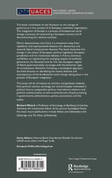 This book contributes to the literature on the change of governance in the context of its European multilevel organization. The integration of Europe is a process of fundamental social change: a process of constructing a European society and of deconstructing the national societies. Münch demonstrates that there is a movement away from republican and representative features of a democracy and towards liberal and pluralistic features. The book illustrates this change in the nature of European political regulation, European jurisdiction and the intellectual debates in France, Germany and Britain on legitimising the emerging system of multilevel governance. He discusses how far the new European regime of liberal governmentality converges with the US-American type of constitutional liberalism. Following a sociological approach, the book focuses on identifying the causes, features and consequences of the fundamental social change taking place in the process of European integration. This book will be of interest to scholars and graduate students from political science, sociology, law and philosophy interested in political theory, comparative politics, international relations and political communication as well as practitioners of policy-making in governments, administration, parties, associations and the media.