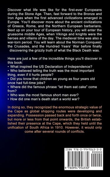 Discover what life was like for the first-ever Europeans during the Stone Age. Then, fast forward to the Bronze and Iron Ages when the first advanced civilizations emerged in Europe. You'll discover more about the ancient civilizations of Greece, Rome, and the Northern European barbarians. Next up on your tour of European history, you will enter the gruesome middle Ages, when Vikings and knights were the heroes and villains of the day. The medieval time was also a war-torn period. You will learn about the Norman Conquest, the Crusades, and the Hundred Years' War before finally discovering the grizzly truth of what the Black Death was. Here are just a few of the incredible things you'll discover in this book:What inspired the US Declaration of Independence? Who believed telling the truth was the most important thing, even if it hurts people? Did you know that children as young as four years old once had full-time jobs? Where did the famous phrase "let them eat cake" come from? Who was the most famous short man ever? How did one man's death start a world war? In doing so, they recognized the enormous strategic value of the Cape as global shipping routes were developing and expanding. Possession passed back and forth once or twice, but more or less from that point onwards, the British established their presence at the Cape, which they held until the unification of South Africa in 1910. However, it would only come after several rounds of conflicts.