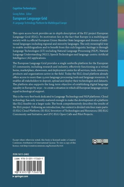 This open access book provides an in-depth description of the EU project European Language Grid (ELG). Its motivation lies in the fact that Europe is a multilingual society with 24 official European Union Member State languages and dozens of additional languages including regional and minority languages. The only meaningful way to enable multilingualism and to benefit from this rich linguistic heritage is through Language Technologies (LT) including Natural Language Processing (NLP), Natural Language Understanding (NLU), Speech Technologies and language-centric Artificial Intelligence (AI) applications. The European Language Grid provides a single umbrella platform for the European LT community, including research and industry, effectively functioning as a virtual home, marketplace, showroom, and deployment centre for all services, tools, resources, products and organisations active in the field. Today the ELG cloud platform already offers access to more than 13,000 language processing tools and language resources. It enables all stakeholders to deposit, upload and deploy their technologies and datasets. The platform also supports the long-term objective of establishing digital language equality in Europe by 2030 - to create a situation in which all European languages enjoy equal technological support. This is the very first book dedicated to Language Technology and NLP platforms. Cloud technology has only recently matured enough to make the development of a platform like ELG feasible on a larger scale. The book comprehensively describes the results of the ELG project. Following an introduction, the content is divided into four main parts: (I) ELG Cloud Platform; (II) ELG Inventory of Technologies and Resources; (III) ELG Community and Initiative; and (IV) ELG Open Calls and Pilot Projects.