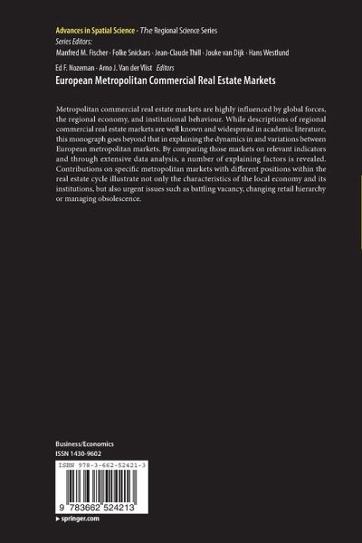 1 Introduction.- 2 Institutional Difference in European Metropolitan Commercial Real Estate Markets.- 3 Financial Markets in London Metropolitan Commercial Real Estate.- 4 Building Activities in Barcelona and Madrid Metropolitan Areas.- 5 Land Policy and Vacancies in the Metropolitan Amsterdam Office Market.- 6 Ten Year Belgium Office and Retail Markets with a Digression on Vacancy Modelling.- 7 On Urban Hierarchy in the Budapest Metropolitan Area.- 8 Rent Gradient in Germany's Metropolitan Commercial Real Estate Markets.- 9 Urban Renewal in Warsaw's Commercial Real Estate Market.- 10 Booms and Busts in Prague's Commercial Real Estate Market.- 11 Geopolitical Change in Vienna's Real Estate Market.- 12 Dynamics of Intra Urban Hierarchy in Istanbul's Metropolitan Area.- Index.