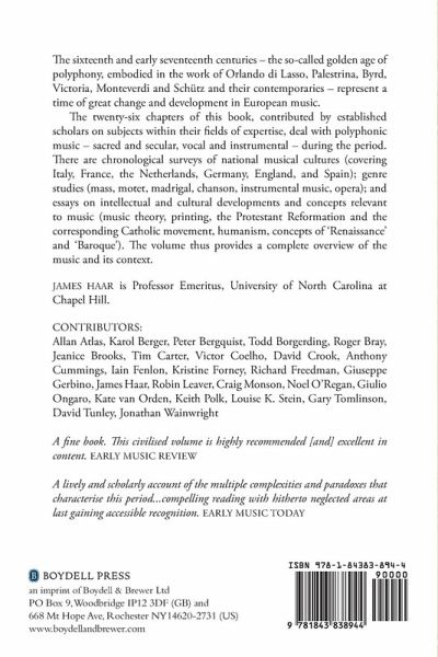 The sixteenth and early seventeenth centuries - the so-called Golden Age of Polyphony - represent a time of great change and development in European music, with the flourishing of Orlando di Lasso, Palestrina, Byrd, Victoria, Monteverdi and Schütz among others. The chapters of this book, contributed by established scholars on subjects within their fields of expertise, deal with polyphonic music - sacred and secular, vocal and instrumental - during this period. The volume offers chronological surveys of national musical cultures (in Italy, France, the Netherlands, Germany, England, and Spain); genre studies (Mass, motet, madrigal, chanson, instrumental music, opera); and is completed with essays on intellectual and cultural developments and concepts relevant to music (music theory, printing, the Protestant Reformation and the corresponding Catholic movement, humanism, concepts of "Renaissance" and "Baroque"). It thus provides a complete overview of the music and its context