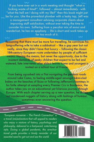 A laugh out loud page turning travelogue in the tradition of Bill Bryson and Tim Moore, European Nonsense: The French Connection is a quirky travel writing book with a difference - for all of us on the wrong side of 50 and finally free of those pesky children that have bled us dry for years. "This is a very unique style that appeals to anyone with wanderlust, anyone who wants to escape the rat race and anyone who enjoys humour with a bit of history. Married couples will love the stories as this couple experience many funny moments in their quest to unshackle themselves from life for a thoroughly enjoyable trip in France and beyond". Monica. "A thoroughly enjoyable read by an obviously funny man". Kate. "If you need a mix of history, wit and a travel adventure story or two this is the book for you!" Ms Spence. If you have ever sat in a work meeting and thought "what a complete waste of time?", followed - almost immediately - with "what the hell am I doing with my life?" then this book is for you. Like the proverbial plumber with a leaky tap, Jeff was a management consultant advising corporate clients about improving staff satisfaction, without ever taking the time to consider his own. Suffering from a peculiar mix of ennui and wanderlust, he has an epiphany - life is short and work takes up far too much of it. Reasoning that there must be more fun travelling, he convinces his long-suffering wife to take a sabbatical - like a gap year but not really, since they didn't have that luxury - following the classic 18th-century European route undertaken by people of sufficient means. Having the means, but never the opportunity, due to the insistent demands of pesky children that expect to be fed and watered, fate intervenes after eldest leaves home and youngest is invited on a school tour of France. From being squashed into a Fiat navigating the perilous roads around Lake Como, to feeling middle-aged amongst bikini-clad babes on the beaches of Ibiza or following Jefferson's footsteps in his futile attempt at sampling every Premier Cru in Bordeaux, the author takes you on an educational yet hilarious journey through Europe. With each chapter serving up a new question, he dishes out condensed nuggets of history along with lashings of humour, sometimes even answering the question. "European nonsense - The French Connection" is a travel (mis)adventure that will appeal to readers who enjoy a mixture of history, psychology and philosophy, delivered in a fast-paced, entertaining style. During a global pandemic, this armchair travel guide provides a timely reminder of our essential need to get out and see the world.
