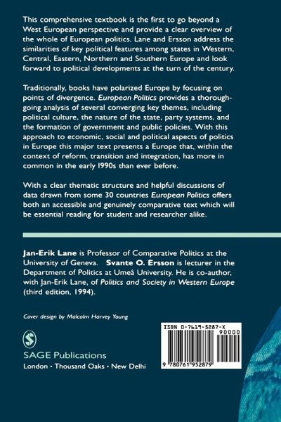 `An unusual combination of a thoroughly focused book - in the style of Lijphart - and a comprehensive study with qualities of a textbook' - Professor Dr. Klaus von Beyme, Universitat HeidelbergThis comprehensive textbook is the first to go beyond a West European perspective and provide a clear overview of the whole of European politics. Jan-Erik Lane and Svante Ersson address the similarities of key political features among states in Western, Central, Eastern, Northern and Southern Europe and look forward to political developments at the turn of the century.European Politics provides a thoroughgoing analysis of several converging themes, including political culture, the nature of the state, party systems, and the formation of government and public policies. With this approach to economic, social and political aspects of politics in Europe this major text presents a Europe that, within the context of reform, transition and integration, has more in common in the early 1990s than ever before.
