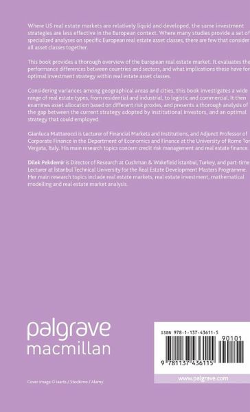 List of Tables List of Figures Acknowledgments Notes on the Contributors Introduction 1. European Real Estate Markets Comparison; Dilek Pekdemir 2. Global Cities vs Other Cities in Europe; Anisa Ago 3. Residential Real Estate: single and multi-family buildings; Angelo Marinangeli and Albana Nako 4. Retail Real Estate in Europe; Aamir Inam Bhutta and Marco Migliorelli 5. European Industrial and Logistics Sector; Aamir Inam Bhutta and Marco Migliorelli 6. European indirect investors and asset allocation; Angelo Marinangeli and Albana Nako 7. Performance Comparison among Real Estate Asset Types and Geographical Areas; Dilek Pekdemir 8. Optimal asset allocation for European real estate; Gianluca Mattarocci 9. Asset allocation strategy and market return for real estate institutional investors; Gianluca Mattarocci