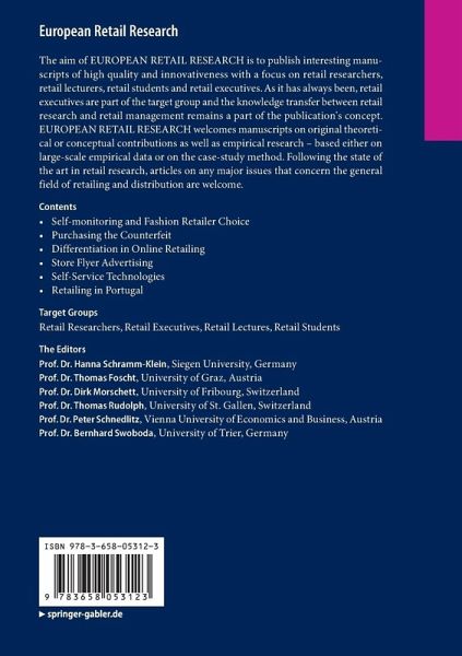 The aim of EUROPEAN RETAIL RESEARCH is to publish interesting manuscripts of high quality and innovativeness with a focus on retail researchers, retail lecturers, retail students and retail executives. As it has always been, retail executives are part of the target group and the knowledge transfer between retail research and retail management remains a part of the publication's concept. EUROPEAN RETAIL RESEARCH welcomes manuscripts on original theoretical or conceptual contributions as well as empirical research - based either on large-scale empirical data or on the case-study method.…mehr