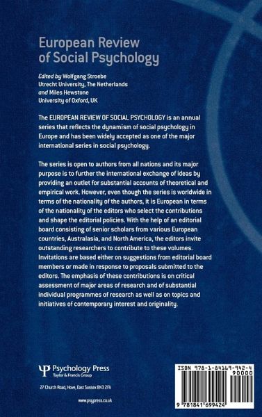 The European Review of Social Psychology is an annual series that reflects the dynamism of social psychology in Europe and has been widely accepted as one of the most important international series in social psychology. The series is open to authors from all nations and its primary purpose is to further the international exchange of ideas by providing an outlet for substantial accounts of theoretical and empirical work. With the help of an editorial board consisting of senior scholars from various European countries, Australasia and North America, the editors invite outstanding researchers to contribute to these volumes. Invitations are based either on suggestions from editorial board members or made in response to proposals submitted to the editors. The emphasis of these contributions is on critical assessment of major areas of research and of substantial individual programmes of research as well as on topics and initiatives of contemporary interest and originality.