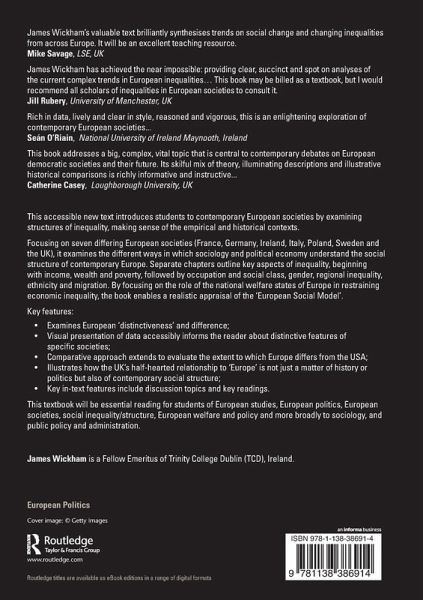 This accessible new text introduces students to contemporary European societies by examining structures of inequality, making sense of the empirical and historical contexts. Focusing on seven differing European societies (France, Germany, Ireland, Italy, Poland, Sweden and the UK), it examines the different ways in which sociology and political economy understand the social structure of contemporary Europe. Separate chapters outline key aspects of inequality, beginning with income, wealth and poverty, followed by occupation and social class, gender, regional inequality, ethnicity, and migration. By focusing on the role of the national welfare states of Europe in restraining economic inequality, the book enables a realistic appraisal of the 'European Social Model'. Key features: Examines European 'distinctiveness' and difference; Visual presentation of data accessibly informs the reader about distinctive features of specific societies; Comparative approach extends to evaluate the extent to which Europe differs from the USA; Illustrates how the UK's half-hearted relationship to 'Europe' is not just a matter of history or politics but also of contemporary social structure; Key in-text features include discussion topics and key readings. This textbook will be essential reading for students of European studies, European politics, European societies, social inequality/structure, European welfare and policy and more broadly to sociology and public policy and administration.