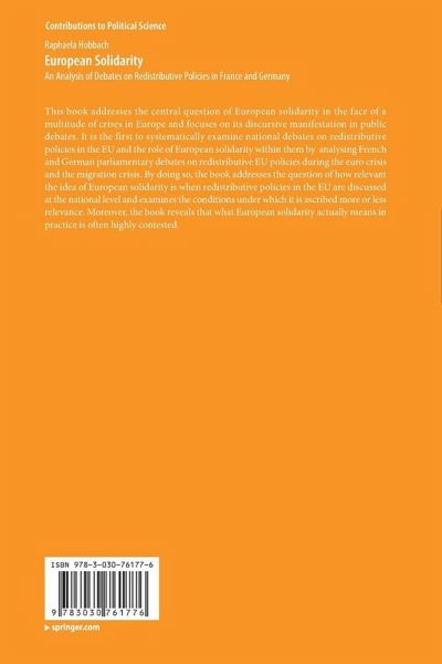 This book addresses the central question of European solidarity in the face of a multitude of crises in Europe and focuses on its discursive manifestation in public debates. It is the first to systematically examine national debates on redistributive policies in the EU and the role of European solidarity within them by analysing French and German parliamentary debates on redistributive EU policies during the euro crisis and the migration crisis. By doing so, the book addresses the question of how relevant the idea of European solidarity is when redistributive policies in the EU are discussed at the national level and examines the conditions under which it is ascribed more or less relevance. Moreover, the book reveals that what European solidarity actually means in practice is often highly contested.