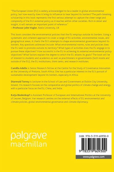 This book considers the environmental policies that the EU employs outside its borders. Using a systematic and coherent approach to cover a range of EU activities, environmental issues, and geographical areas, it charts the EU's attempts to shape environmental governance beyond its borders. Key questions addressed include: What environmental norms, rules and policies does the EU seek to promote outside its territory? What types of activities does the EU engage in to pursue these objectives? How successful is the EU in achieving its external environmental policy objectives? What factors explain the degree to which the EU attains its goals? The book will be of interest to students and academics as well as practitioners in governments (both inside and outside of the EU), the EU institutions, think tanks, and research institutes.