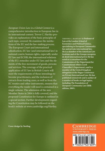 European Union Law in a Global Context is a comprehensive introduction to European law in its international context. Trevor Hartley provides an explanation of the basic principles of each topic covered. He examines the institutions of the EU and the law-making process; the European Court and international adjudication; EU law (and international law) in national courts; human rights, especially under EU law and the ECHR; the international relations of the EU; remedies under EU law; and the elements of the free movement of goods, persons and services. The coverage of the practical application of EU law in British courts will meet the requirements of those intending to become practitioners, and the inclusion of extracts from leading cases, as well as from the EC treaties and other instruments, ensures that everything the reader will need is contained in a single volume.