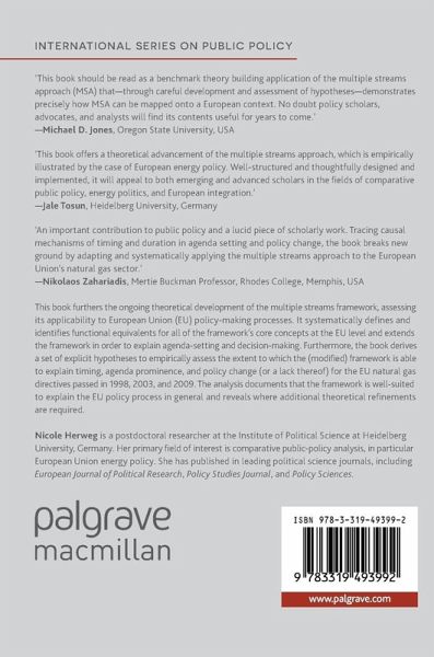 This book furthers the ongoing theoretical development of the multiple streams framework, assessing its applicability to European Union (EU) policy-making processes. It systematically defines and identifies functional equivalents for all of the framework's core concepts at the EU level and extends the framework in order to explain agenda-setting and decision-making. Furthermore, the book derives a set of explicit hypotheses to empirically assess the extent to which the (modified) framework is able to explain timing, agenda prominence, and policy change (or a lack thereof) for the EU natural gas directives passed in 1998, 2003, and 2009. The analysis documents that the framework is well-suited to explain the EU policy process in general and reveals where additional theoretical refinements are required.