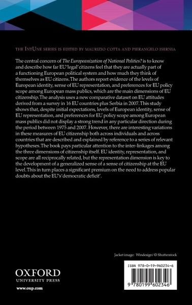 The Europeanization of National Polities? studies the levels and evolution of EU citizens' attitudes toward the EU by answering 3 key questions: How widespread is the sense of European citizenship? What are its core drivers? And what consequences does citizenship have, if any, for EU support and for active political participation in EU politics?The central concern ofThe Europeanization of National Polities? is to know and describe how far EU 'legal' citizens feel that they are actually part of a functioning European political system and how much they think of themselves as EU citizens. The authors report evidence of the levels of European identity, sense of EU representation and preferences for EU policy scope among European mass publics, which are the main dimensions of EU citizenship. The analysis uses a new comparative dataset on EU attitudes derived from a survey in 16 EU countries plus Serbia in 2007. This study shows that, despite initial expectations, levels of European identity, sense of EU representation, and preferences for EU policy scope among European mass publics did not display a strong trend in any particular direction during the period between 1975 and 2007. However, there are interesting variations in these measures of EU citizenship both across individuals and across countries that are described and explained by reference to a series of relevant hypotheses. The book pays particular attention to the inter-linkages among the three dimensions of citizenship itself. EU identity, representation and scope are all reciprocally related, but the representation dimension is key to the development of a generalised sense of a sense of citizenship at the EU level. This in turn places a significant premium on the need to address popular doubts about the EU's 'democratic deficit'.