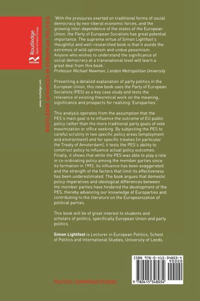 Presenting a detailed explanation of party politics in the European Union, this new book uses the Party of European Socialists (PES) as a key case study, and tests the relevance of existing theoretical work on the meaning, significance, and prospects for realising other 'Europarties'. This analysis operates from the assumption that the PES's main goal is to influence the outcome of EU public policy, rather than the more traditional party goals of vote maximisation or office seeking. Secondly, by subjecting the PES to careful scrutiny in two specific policy areas (employment and environment) and for specific treaties (in particular the Treaty of Amsterdam), it tests the PES's ability to construct policy to influence actual policy outcomes. Finally, it shows that whilst the PES was able to play a role in co-ordinating policy amongst the member parties since its formation in 1992, its influence has been exaggerated and the strength of the factors that limit its effectiveness have been underestimated. It argues that domestic policy imperatives and ideological differences between the member parties have hindered the development of the PES, thereby advancing our knowledge of Europarties and contributing to the literature on the Europeanization of political parties. This book will be of great interest to students and scholars of the European Union and party politics in general.
