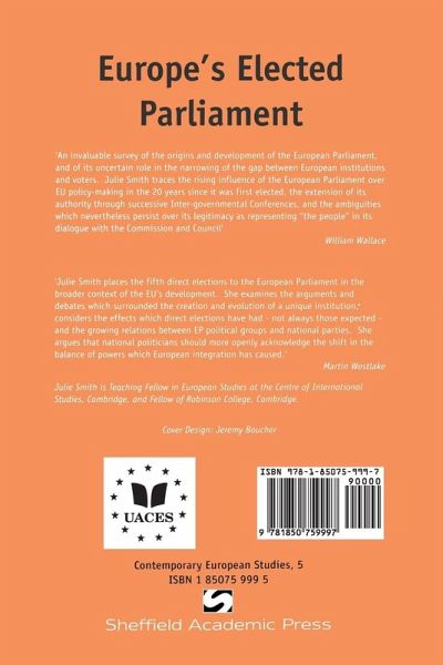 'An invaluable survey of the origins and development of the European Parliament, and of its uncertain role in narrowing the gap between European institutions and voters. Julie Smith traces the rising influence of the European Parliament over EU policy-making in the 20 years since it was first elected, the extension if its authority through successive Inter-governmental Conferences, and the ambiguities which nevertheless persist over its legitimacy as representing 'the people' in its dialogue with the Commission and Council.' WILLIAM WALLACE 'Julie Smith places the fifth direct elections to the European Parliament in the broader context of the EU's development. She examines the arguments and debates which surrounded the creation and evolution of a unique institution, considers the effects which direct elections have had - not always those expected - and the growing relations between EP political groups and national parties. She argues that national politicians should more openly acknowledge the shift in the balance of powers which European integration has caused.' MARTIN WESTLAKE This title is published in conjunction with UACES, the University Association for Contemporary European Studies. UACES web site can be found at www.uaces.org
