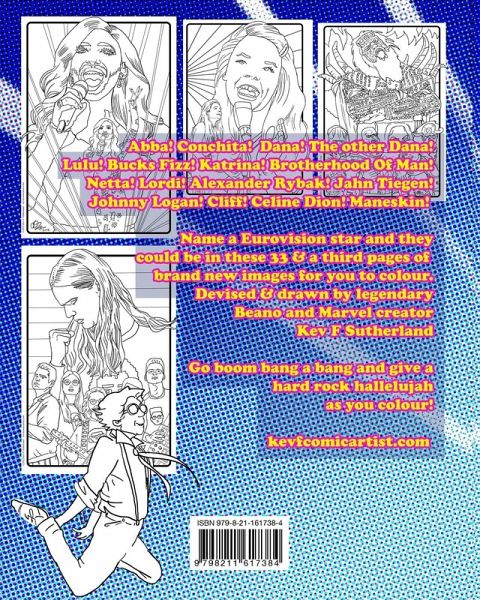 A colouring book for adults and kids of all ages, with 34 top Eurovision pop stars from the 50s to the 2020s, all drawn specially by Kev F Sutherland (of Beano and Marvel comics fame) with brand new text about every act facing each image. A colouring book for adults and kids of all ages, with 34 top Eurovision pop stars from the 50s to the 2020s, all drawn specially by Kev F Sutherland (of Beano and Marvel comics fame) with brand new text about every act facing each image. Buck's Fizz Brotherhood of Man ABBA Lordi Conchita Wurst Alexander Rybak Dana Dana International Katrina and the Waves Johnny Logan Keiino Sandy Shaw Cliff Richard Lulu France Gall Domenico Modugno Jahn Teigen Jemini Maneskin Netta Mans Zelmerloew Loreen Terry Wogan Celine Dion Verka Serduchka Jedward Riverdance Eleni Fouriera Sandra Kim Jamala Daði Freyr and Gagnamagnið Fire Saga Lys Assia Anyone we've missed?