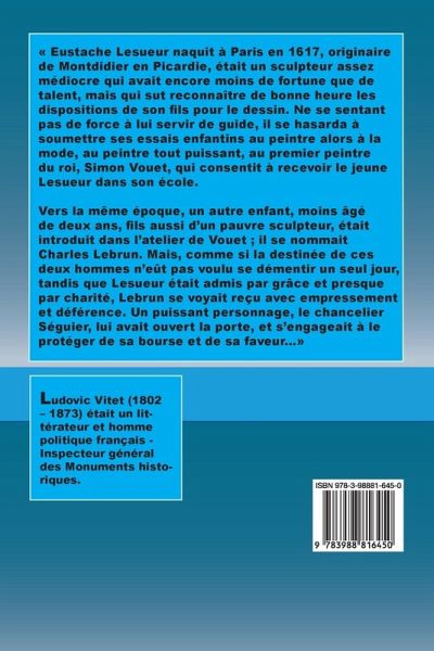 Eustache Lesueur naquit à Paris en 1617, originaire de Montdidier en Picardie, était un sculpteur assez médiocre qui avait encore moins de fortune que de talent, mais qui sut reconnaître de bonne heure les dispositions de son fils pour le dessin. Ne se sentant pas de force à lui servir de guide, il se hasarda à soumettre ses essais enfantins au peintre alors à la mode, au peintre tout puissant, au premier peintre du roi, Simon Vouet, qui consentit à recevoir le jeune Lesueur dans son école. Vers la même époque, un autre enfant, moins âgé de deux ans, fils aussi d'un pauvre sculpteur, était introduit dans l'atelier de Vouet ; il se nommait Charles Lebrun. Mais, comme si la destinée de ces deux hommes n'eût pas voulu se démentir un seul jour, tandis que Lesueur était admis par grâce et presque par charité, Lebrun se voyait reçu avec empressement et déférence. Un puissant personnage, le chancelier Séguier, lui avait ouvert la porte, et s'engageait à le protéger de sa bourse et de sa faveur...