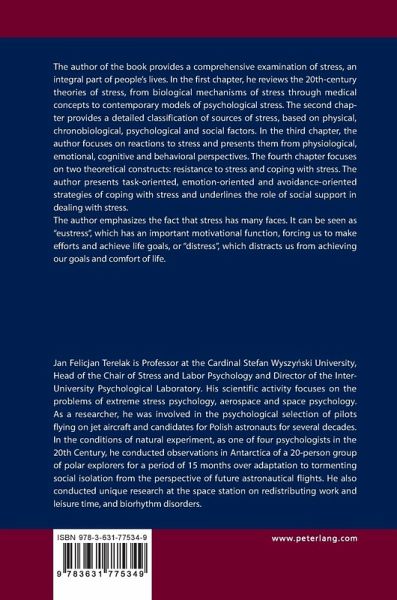 The author of the book provides a comprehensive examination of stress, an integral part of people's lives. In the first chapter, he reviews the 20th-century theories of stress, from biological mechanisms of stress through medical concepts to contemporary models of psychological stress. The second chapter provides a detailed classification of sources of stress, based on physical, chronobiological, psychological and social factors. In the third chapter, the author focuses on reactions to stress and presents them from physiological, emotional, cognitive and behavioral perspectives. The fourth chapter focuses on two theoretical constructs: resistance to stress and coping with stress. The author presents task-oriented, emotion-oriented and avoidance-oriented strategies of coping with stress and underlines the role of social support in dealing with stress.
