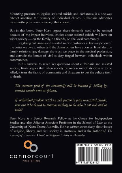 Mounting pressure to legalise assisted suicide and euthanasia is a one-way ratchet asserting the primacy of individual choice. Euthanasia advocates insist nothing can ever outweigh that choice. But in this book, Peter Kurti argues these demands need to be resisted because of the impact individual choice about assisted suicide will have on wider society - on the family, on friends, on the local community. Legalising euthanasia and assisted suicide enshrines in law a rejection of the duties we owe to others and the claims others have upon us. It will destroy family relationships, damage the trust we place in the medical profession, and corrode the bonds of civil society forged between individuals within communities. In his answers to seven key questions about euthanasia and assisted suicide, Kurti argues that when society permits some of its citizens to be killed, it tears the fabric of community and threatens to put the culture itself to death.