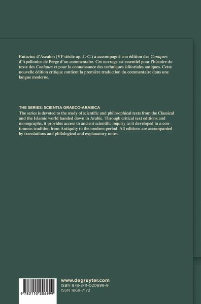Eutocius of Ascalon (4th cent. AD) accompanied his edition of the first four books of Apollonius of Perga's Konika with a commentary. His work is relevant to the history of conic sections and important for the textual transmission of Apollonius. This new critical edition contains the first translation into a modern language and complements the Graeco-Arabic edition of the first four books of the Konika (SGA 1-2).