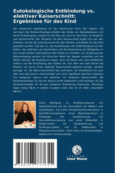 Die eutokische Entbindung ist die natürlichste Form der Geburt und verringert bei Risikoschwangerschaften das Risiko von Komplikationen und deren Schweregrad, sowohl für die Frau als auch für das Kind, im Vergleich zum Kaiserschnitt. Der Vergleich mit dem Kaiserschnitt ergibt sich aus den Zweifeln, die bei der Literaturrecherche über Risiken und Nutzen für das Kind geäußert wurden. Ziel war es, die Auswirkungen der Entbindungsart auf das Stillen, das Auftreten von Krankheiten und die Entwicklung von Fähigkeiten in den ersten beiden Lebensjahren des Kindes zu ermitteln. Zur Ergänzung der Datenerhebung wurden die klinischen Akten der Dyaden analysiert und die Mütter befragt. Die Ergebnisse zeigen, dass die Dauer des ausschließlichen Stillens und die Fortsetzung des Stillens bis zum Alter von zwei Jahren bei Kindern, die durch einen elektiven Kaiserschnitt geboren wurden, deutlich geringer ist. Die Wahrscheinlichkeit des Auftretens von Krankheiten bis zum Alter von zwei Jahren unterscheidet sich nicht signifikant zwischen Geburten mit eutogener Geburt und Geburten mit elektivem Kaiserschnitt. Die Kompetenzindizes für die per Kaiserschnitt Geborenen sind niedriger als die Kompetenzindizes für die per eutogener Entbindung Geborenen. Allerdings lagen einige Werte in beiden Gruppen unter den für ihr Alter erwarteten Werten.