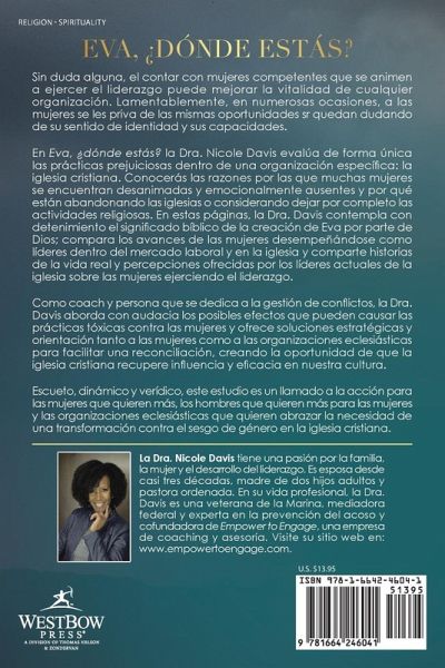 Sin duda alguna, el contar con mujeres competentes que se animen a ejercer el liderazgo puede mejorar la vitalidad de cualquier organización. Lamentablemente, en numerosas ocasiones, a las mujeres se les priva de las mismas oportunidades sr quedan dudando de su sentido de identidad y sus capacidades. En Eva, ¿dónde estás? la Dra. Nicole Davis evalúa de forma única las prácticas prejuiciosas dentro de una organización específica: la iglesia cristiana. Conocerás las razones por las que muchas mujeres se encuentran desanimadas y emocionalmente ausentes y por qué están abandonando las iglesias o considerando dejar por completo las actividades religiosas. En estas páginas, la Dra. Davis contempla con detenimiento el significado bíblico de la creación de Eva por parte de Dios; compara los avances de las mujeres desempeñándose como líderes dentro del mercado laboral y en la iglesia y comparte historias de la vida real y percepciones ofrecidas por los líderes actuales de la iglesia sobre las mujeres ejerciendo el liderazgo. Como coach y persona que se dedica a la gestión de conflictos, la Dra. Davis aborda con audacia los posibles efectos que pueden causar las prácticas tóxicas contra las mujeres y ofrece soluciones estratégicas y orientación tanto a las mujeres como a las organizaciones eclesiásticas para facilitar una reconciliación, creando la oportunidad de que la iglesia cristiana recupere influencia y eficacia en nuestra cultura. Escueto, dinámico y verídico, este estudio es un llamado a la acción para las mujeres que quieren más, los hombres que quieren más para las mujeres y las organizaciones eclesiásticas que quieren abrazar la necesidad de una transformación contra el sesgo de género en la iglesia cristiana.