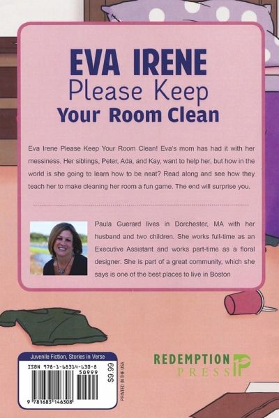 Eva Irene Please Keep Your Room Clean! Eva's mom has had it with her messiness. Her siblings, Peter, Ada, and Kay, want to help her, but how in the world is she going to learn to be neat? Read along and see how they teach her to make cleaning her room a fun game. The end will surprise you.