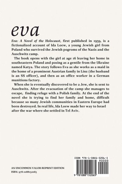 Eva: A Novel of the Holocaust, first published in 1959, is a fictionalized account of Ida Loew, a young Jewish girl from Poland who survived the Jewish pogroms of the Nazis and the Auschwitz camp. The book opens with the girl at age 16 leaving her home in southeastern Poland and posing as a gentile from the Ukraine named Katya. The story follows Eva as she works as a maid in the home of a prominent Austrian family in Linz (the husband is an SS officer), and then as an office worker in a German munitions factory. When she is eventually discovered to be a Jew, she is sent to Auschwitz. After the evacuation of the camp she manages to escape, finding refuge with a Polish family. At the end of the novel she is trying to find her family and home, difficult because so many Jewish communities in Eastern Europe had been destroyed. In real life, Ida Loew made her way to Israel after the war where she settled in Tel Aviv.