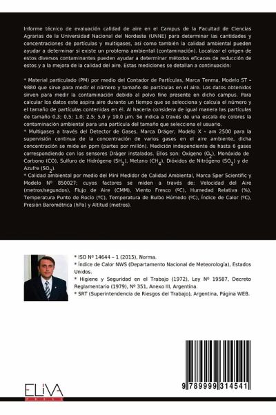 Informe técnico de evaluación calidad de aire en el Campus de la Facultad de Ciencias Agrarias de la Universidad Nacional del Nordeste (UNNE) para determinar las cantidades y concentraciones de partículas y multigases, así como también la calidad ambiental pueden ayudar a determinar si existe un problema ambiental (contaminación). Localizar el origen de estos diversos contaminantes pueden ayudar a determinar métodos eficaces de reducción de estos y a la mejora de la calidad del aire. Estas mediciones se detallan a continuación: * Material particulado (PM) por medio del Contador de Partículas, Marca Tenma, Modelo ST - 9880 que sirve para medir el número y tamaño de partículas en el aire. Los datos obtenidos sirven para medir la contaminación debido al polvo fino presente en dicho campus. Para calcular los datos este aspira aire durante un tiempo que se selecciona y calcula el número y el tamaño de partículas contenidas en él. Al hacerla considera de igual manera las partículas de tamaño 0,3; 0,5; 1,0; 2,5; 5,0 y 10,0 µm. Se indica a través de una escala de colores la contaminación ambiental para una partícula del tamaño que selecciona el usuario. * Multigases a través del Detector de Gases, Marca Dräger, Modelo X - am 2500 para la supervisión continua de la concentración de varios gases en el aire ambiente, dicha concentración se mide en ppm (partes por millón). Medición independiente de hasta 6 gases correspondiendo con los sensores Dräger instalados. Ellos son: Oxígeno (O2), Monóxido de Carbono (CO), Sulfuro de Hidrógeno (SH2), Metano (CH4), Dióxidos de Nitrógeno (SO2) y de Azufre (SO2). * Calidad ambiental por medio del Mini Medidor de Calidad Ambiental, Marca Sper Scientific y Modelo Nº 850027; cuyos factores se miden a través de: Velocidad del Aire (metros/segundos), Flujo de Aire (CMM), Viento Fresco (ºC), Humedad Relativa (%), Temperatura Punto de Rocío (ºC), Temperatura de Bulbo Húmedo (ºC), Índice de Calor (ºC), Presión Barométrica (hPa) y Altitud (metros).