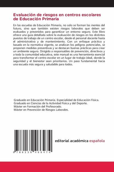 En las escuelas de Educación Primaria, no solo se forman las mentes del futuro, sino que también existen riesgos laborales que deben ser evaluados y prevenidos para garantizar un entorno seguro. Este libro ofrece una guía detallada sobre la evaluación de riesgos en los distintos puestos de trabajo de un centro escolar, desde el personal docente hasta el administrativo y de mantenimiento. Con un enfoque práctico y basado en la normativa vigente, se analizan los peligros potenciales, se proponen medidas preventivas y se destacan buenas prácticas para crear un ambiente seguro. Dirigido a responsables de prevención, directivos y a toda la comunidad educativa, este manual es una herramienta esencial para transformar el centro escolar en un lugar de trabajo ideal, donde la seguridad y el bienestar sean prioritarios. Un paso fundamental hacia una escuela más segura y saludable para todos.