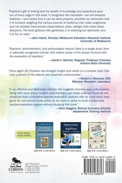 s Role Evaluation Basics What about the Evaluation of Teachers? Judgment-Requisite Choices Chapter Implications for Three Audiences 3. Defensible Teacher Evaluation The Wonders of Whereas Why Use a Weighted-Evidence Judgmental Approach to Teacher Evaluation? A Weighted-Evidence Judgment Evaluative Survey Who Are the Judges? Chapter Implications for Three Audiences 4. Evidence from Standardized Tests Key Testing Tenets Why We Test A Psychometric Blessed Trinity Standardized Test- Two Tribes, Two Tasks Traditional Test-Building and Its Off-Task Allure The Origins of Traditional Educational Testing Dealing with Effective Instruction Ensuring Score-Spread from the Get-Go Instructional Sensitivity as a Requisite Returning to Validity Evidential-Weight Guidelines Chapter Implications for Three Audiences 5. Evidence from Classroom Assessments Staking Out the Nature of "Classroom Assessment" A Quest for Evidence of Student Growth Formative and Summative Applications Enhancing the Quality of Classroom-Assessment Evidence Evidence of a Teacher