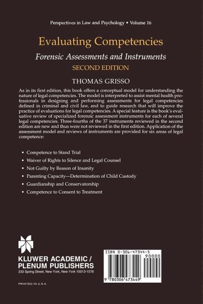 As in its first edition, this book offers a conceptual model for understanding the nature of legal competencies. The model is interpreted to assist mental health professionals in designing and performing assessments for legal competencies defined in criminal and civil law, and to guide research that will improve the practice of evaluations for legal competencies. A special feature is the book's evaluative review of specialized forensic assessment instruments for each of several legal competencies. Three-fourths of the 37 instruments reviewed in the second edition are new and thus were not reviewed in the first edition.