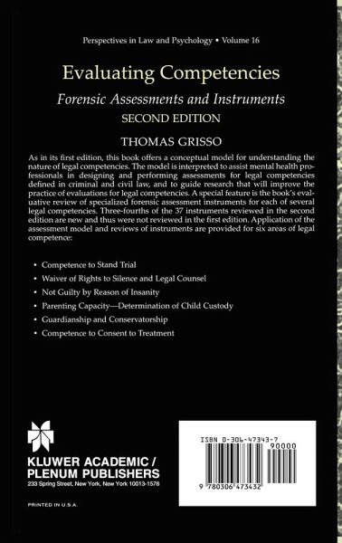As in its first edition, this book offers a conceptual model for understanding the nature of legal competencies. The model is interpreted to assist mental health professionals in designing and performing assessments for legal competencies defined in criminal and civil law, and to guide research that will improve the practice of evaluations for legal competencies. A special feature is the book's evaluative review of specialized forensic assessment instruments for each of several legal competencies. Three-fourths of the 37 instruments reviewed in the second edition are new and thus were not reviewed in the first edition.