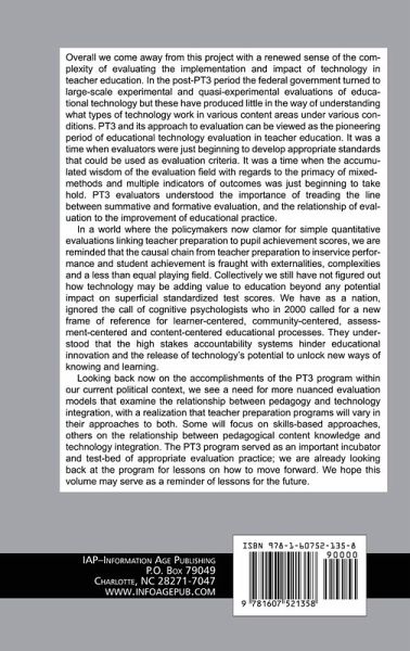A volume in Research Methods in Educational Technology Series Editor Walter F. Heinecke, University of Virginia Overall we come away from this project with a renewed sense of the complexity of evaluating the implementation and impact of technology in teacher education. In the post-PT3 period the federal government turned to large-scale experimental and quasi-experimental evaluations of educational technology but these have produced little in the way of understanding what types of technology work in various content areas under various conditions. PT3 and its approach to evaluation can be viewed as the pioneering period of educational technology evaluation in teacher education. It was a time when evaluators were just beginning to develop appropriate standards that could be used as evaluation criteria. It was a time when the accumulated wisdom of the evaluation field with regards to the primacy of mixedmethods and multiple indicators of outcomes was just beginning to take hold. PT3 evaluators understood the importance of treading the line between summative and formative evaluation, and the relationship of evaluation to the improvement of educational practice. In a world where the policymakers now clamor for simple quantitative evaluations linking teacher preparation to pupil achievement scores, we are reminded that the causal chain from teacher preparation to inservice performance and student achievement is fraught with externalities, complexities and a less than equal playing field. Collectively we still have not figured out how technology may be adding value to education beyond any potential impact on superficial standardized test scores. We have as a nation, ignored the call of cognitive psychologists who in 2000 called for a new frame of reference for learner-centered, community-centered, assessment- centered and content-centered educational processes. They understood that the high stakes accountability systems hinder educational innovation and the release of technology's potential to unlock new ways of knowing and learning. Looking back now on the accomplishments of the PT3 program within our current political context, we see a need for more nuanced evaluation models that examine the relationship between pedagogy and technology integration, with a realization that teacher preparation programs will vary in their approaches to both. Some will focus on skills-based approaches, others on the relationship between pedagogical content knowledge and technology integration. The PT3 program served as an important incubator and test-bed of appropriate evaluation practice; we are already looking back at the program for lessons on how to move forward. We hope this volume may serve as a reminder of lessons for the future.