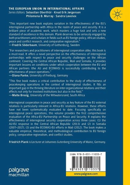 Interregional cooperation in peace and security as key feature of the EU external relations is particularly relevant in Africa-EU relations. However, these efforts have not been systematically evaluated to date. Focusing specifically on interregional peace operations, this volume provides the first comprehensive evaluation of the Africa-EU Partnership on Peace and Security. It explains the effectiveness of interregional security cooperation across three cases: (1) the AU-EU response in the Central African Republic (2013) and (2) in Somalia (2007-2017), (3) and the ECOWAS-EU efforts in Mali (2012). The book makes a valuable empirical, theoretical, and methodological contribution to EU foreign policy, comparative regionalism, and conflict studies.