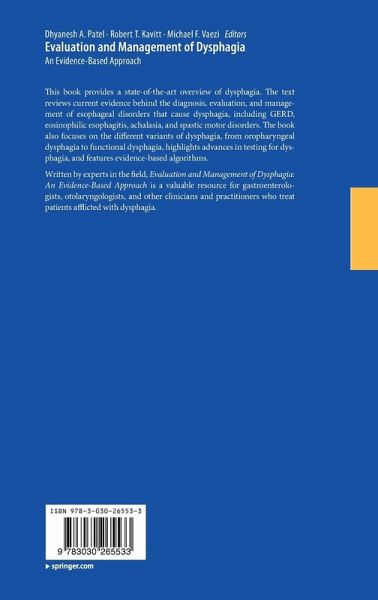 This book provides a state-of-the-art overview of dysphagia. The text reviews current evidence behind the diagnosis, evaluation, and management of esophageal disorders that cause dysphagia, including GERD, eosinophilic esophagitis, achalasia, and spastic motor disorders. The book also focuses on the different variants of dysphagia, from oropharyngeal dysphagia to functional dysphagia, highlights advances in testing for dysphagia, and features evidence-based algorithms. Written by experts in the field, Evaluation and Management of Dysphagia: An Evidence-Based Approach is a valuable resource for gastroenterologists, otolaryngologists, and other clinicians and practitioners who treat patients afflicted with dysphagia.