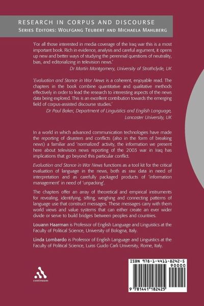 In a world in which advanced communication technologies have made the reporting of disasters and conflicts (also in the form of breaking news) a familiar and 'normalised' activity, the information we present here about television news reporting of the 2003 war in Iraq has implications that go beyond this particular conflict. Evaluation and Stance in War News functions as a tool kit for the critical evaluation of language in the news, both as raw data in need of interpretation and as carefully packaged products of 'information management' in need of 'unpacking'. The chapters offer an array of theoretical and empirical instruments for revealing, identifying, sifting, weighing and connecting patterns of language use that construct messages. These messages carry with them world views and value systems that can either create an ever wider divide or serve to build bridges between peoples and countries.