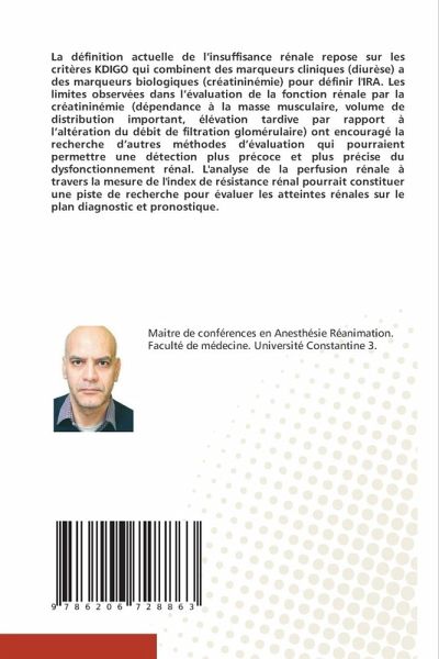 La définition actuelle de l'insuffisance rénale repose sur les critères KDIGO qui combinent des marqueurs cliniques (diurèse) a des marqueurs biologiques (créatininémie) pour définir l'IRA. Les limites observées dans l'évaluation de la fonction rénale par la créatininémie (dépendance à la masse musculaire, volume de distribution important, élévation tardive par rapport à l'altération du débit de filtration glomérulaire) ont encouragé la recherche d'autres méthodes d'évaluation qui pourraient permettre une détection plus précoce et plus précise du dysfonctionnement rénal. L'analyse de la perfusion rénale à travers la mesure de l'index de résistance rénal pourrait constituer une piste de recherche pour évaluer les atteintes rénales sur le plan diagnostic et pronostique.