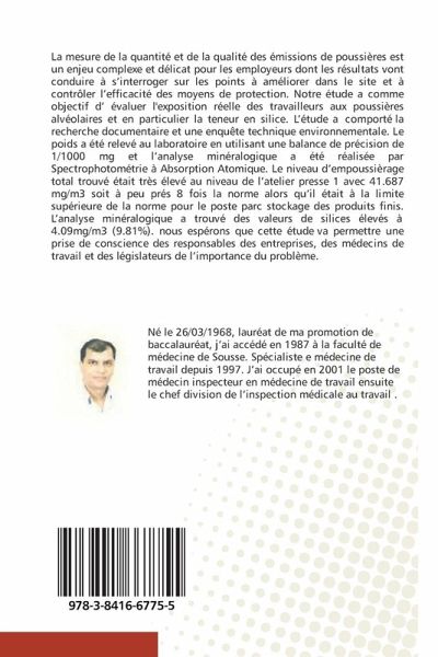 La mesure de la quantité et de la qualité des émissions de poussières est un enjeu complexe et délicat pour les employeurs dont les résultats vont conduire à s'interroger sur les points à améliorer dans le site et à contrôler l'efficacité des moyens de protection. Notre étude a comme objectif d' évaluer l'exposition réelle des travailleurs aux poussières alvéolaires et en particulier la teneur en silice. L'étude a comporté la recherche documentaire et une enquête technique environnementale. Le poids a été relevé au laboratoire en utilisant une balance de précision de 1/1000 mg et l'analyse minéralogique a été réalisée par Spectrophotométrie à Absorption Atomique. Le niveau d'empoussièrage total trouvé était très élevé au niveau de l'atelier presse 1 avec 41.687 mg/m3 soit à peu prés 8 fois la norme alors qu'il était à la limite supérieure de la norme pour le poste parc stockage des produits finis. L'analyse minéralogique a trouvé des valeurs de silices élevés à 4.09mg/m3 (9.81%). nous espérons que cette étude va permettre une prise de conscience des responsables des entreprises, des médecins de travail et des législateurs de l'importance du problème.