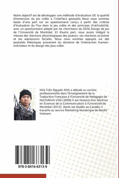 Notre objectif est de de velopper une me thode d'e valuation DE la qualite d'immersion du jeu vide o a l'interface gestuelle. Nous nous sommes base s d'une part sur un questionnaire conc u a partir des crite res d'e valuation du Flux dans le jeu vide o et des principes d'utilisabilite , avec un questionnaire adapte par les chercheurs du DESS Design de jeu de l'Universite de Montre al. Et d'autre part, nous avons inte gre la mesure des re actions physiologiques des joueurs, ses re actions oculaires et ses expressions faciales. Nous nous sommes appuye s sur des postulats the oriques provenant du domaine de l'interaction humain-ordinateur et du design des jeux vide o.
