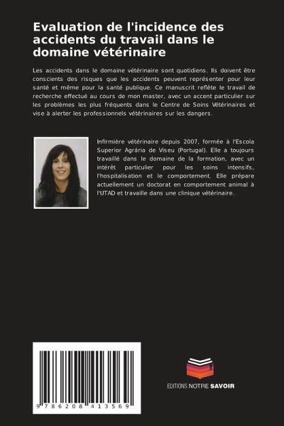 Les accidents dans le domaine vétérinaire sont quotidiens. Ils doivent être conscients des risques que les accidents peuvent représenter pour leur santé et même pour la santé publique. Ce manuscrit reflète le travail de recherche effectué au cours de mon master, avec un accent particulier sur les problèmes les plus fréquents dans le Centre de Soins Vétérinaires et vise à alerter les professionnels vétérinaires sur les dangers.