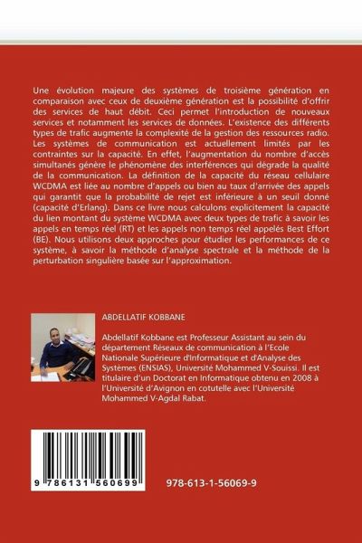 Une évolution majeure des systèmes de troisième génération en comparaison avec ceux de deuxième génération est la possibilité d''offrir des services de haut débit. Ceci permet l''introduction de nouveaux services et notamment les services de données. L''existence des différents types de trafic augmente la complexité de la gestion des ressources radio. Les systèmes de communication est actuellement limités par les contraintes sur la capacité. En effet, l''augmentation du nombre d''accès simultanés génère le phénomène des interférences qui dégrade la qualité de la communication. La définition de la capacité du réseau cellulaire WCDMA est liée au nombre d''appels ou bien au taux d''arrivée des appels qui garantit que la probabilité de rejet est inférieure à un seuil donné (capacité d''Erlang). Dans ce livre nous calculons explicitement la capacité du lien montant du système WCDMA avec deux types de trafic à savoir les appels en temps réel (RT) et les appels non temps réel appelés Best Effort (BE). Nous utilisons deux approches pour étudier les performances de ce système, à savoir la méthode d''analyse spectrale et la méthode de la perturbation singulière basée sur l''approximation.