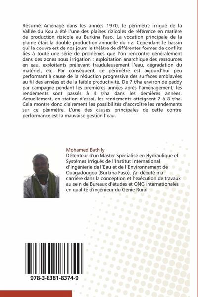 Résumé: Aménagé dans les années 1970, le périmètre irrigué de la Vallée du Kou a été l'une des plaines rizicoles de référence en matière de production rizicole au Burkina Faso. La vocation principale de la plaine était la double production annuelle du riz. Cependant le bassin qui le couvre est de nos jours le théâtre de différentes formes de conflits liés à toute une série de problèmes que l'on rencontre généralement dans des zones sous irrigation : exploitation anarchique des ressources en eau, exploitants prélevant frauduleusement l'eau, dégradation du matériel, etc. Par conséquent, ce périmètre est aujourd'hui peu performant à cause de la réduction progressive des surfaces emblavées au fil des années et de la faible productivité. De 7 t/ha environ de paddy par campagne pendant les premières années après l'aménagement, les rendements sont passés à 4 t/ha dans les dernières années. Actuellement, en station d'essai, les rendements atteignent 7 à 8 t/ha. Cela montre donc clairement les possibilités d'accroître les rendements sur ce périmètre. L'une des causes principales de cette contre performance est la mauvaise gestion l'eau.