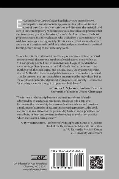 This book highlights views on responsive, participatory and democratic approaches to evaluation from an ethos of care. It critically scrutinizes and discusses the invisibility of care in our contemporary Western societies and evaluation practices that aim to measure practices by external standards. Alternatively, the book proposes several foci for evaluators who work from a care perspective or wish to encourage a caring society. This is a society that sees evaluation and care as a continuously unfolding relational practice of moral-political learning contributing to life-sustaining webs. ‘At one level is the evaluator’s immediately responsive and interpersonal encounter with the personal troubles of social actors, most visible, as Mills originally pointed out, in an individual’s biography and in those social settings directly open to the individual’s lived experience. (…) At another level, the sociological and political level, the evaluator operates at what Mills called the arena of public issues where immediate personal troubles are seen not only as problems encountered by individuals but as the result of structural and political arrangements in society (…) evaluation for a caring society is thought to operate at both levels’ (Thomas A. Schwandt, Professor Emeritus, University of Illinois at Urbana-Champaign). ‘The intricate relationship between evaluation and care is hardly addressed by evaluators or caregivers. This book fills a gap, as it focuses on the relationship between evaluation and care and provides a multitude of examples of evaluation as a caring practice (…) the book can serve as an antidote to the present-day haste in social practices, and contribute, in form and content, to developing an evaluation practice which may foster a caring society’ (Guy Widdershoven, Professor of Philosophy and Ethics of Medicine and head of the Department of Medical Humanities at VU University Medical Center, VU University Amsterdam).