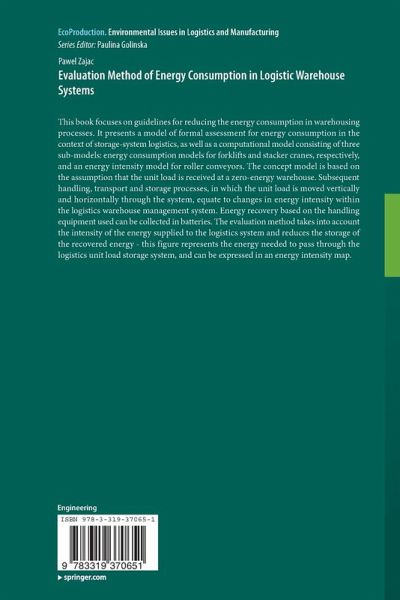 This book focuses on guidelines for reducing the energy consumption in warehousing processes. It presents a model of formal assessment for energy consumption in the context of storage-system logistics, as well as a computational model consisting of three sub-models: energy consumption models for forklifts and stacker cranes, respectively, and an energy intensity model for roller conveyors. The concept model is based on the assumption that the unit load is received at a zero-energy warehouse. Subsequent handling, transport and storage processes, in which the unit load is moved vertically and horizontally through the system, equate to changes in energy intensity within the logistics warehouse management system. Energy recovery based on the handling equipment used can be collected in batteries. The evaluation method takes into account the intensity of the energy supplied to the logistics system and reduces the storage of the recovered energy - this figure represents the energy needed to pass through the logistics unit load storage system, and can be expressed in an energy intensity map.